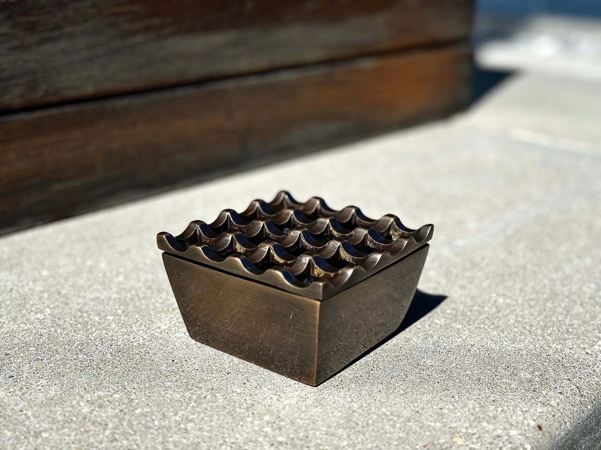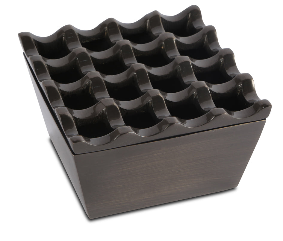Windproof Ashtray with removable top made entirely of Brass with an antique lacquered finish. Its windproof structure features 16 holes, ensuring practical use while maintaining an elegant appearance. Ideal for both indoor and outdoor settings, it's a stylish accessory for any modern space.
