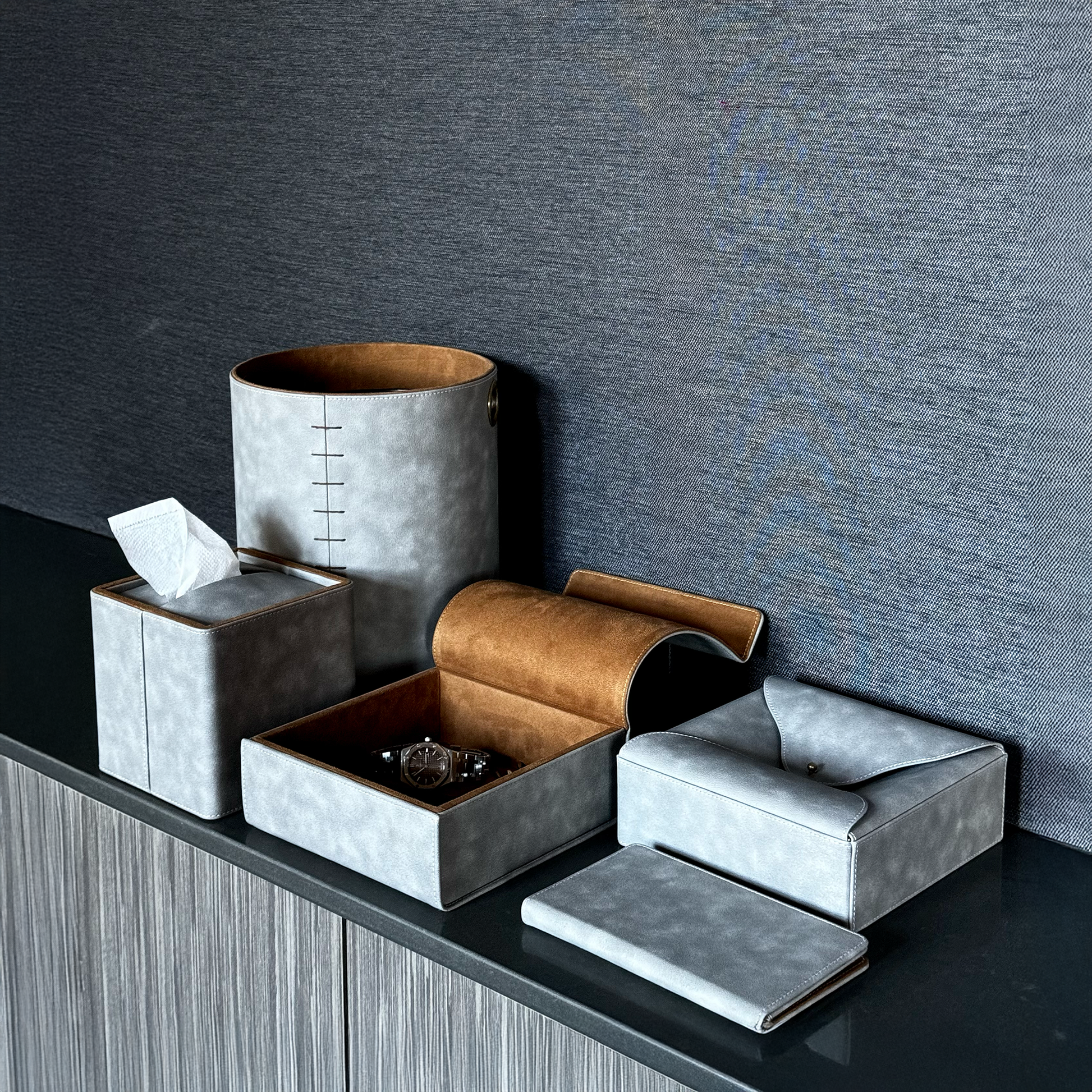 Muted grey grainless leather complemented by brown suede linings and saddle stitching providing loud subtlety, while Champagne gold metal inserts add a touch of opulence. Originally designed for the One & Only Resort, Dubai.
