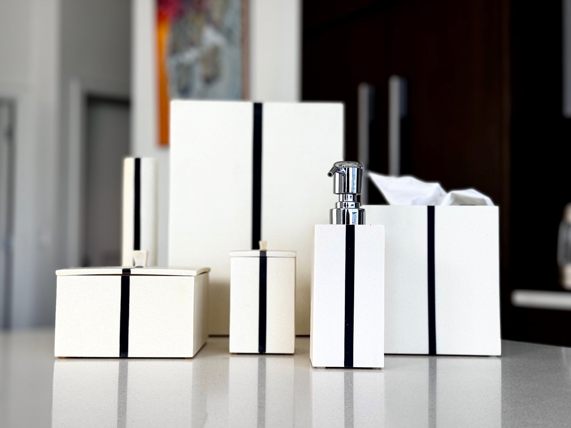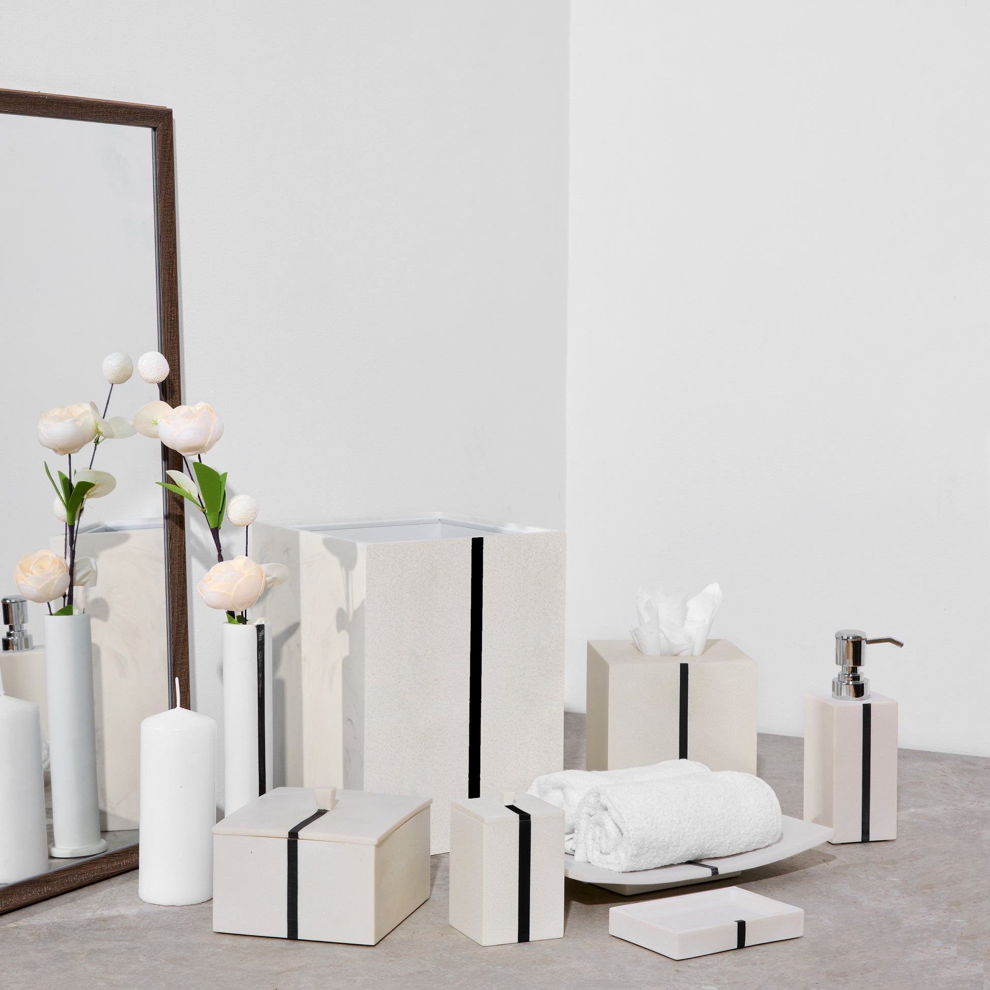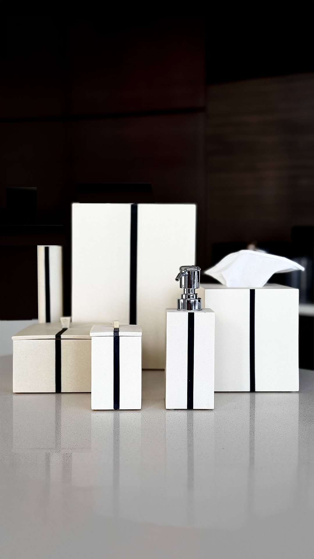Elevate your bathroom with the sleek elegance of the Moderna set, for a contemporary aesthetic. Matte off-white laminate resin to mimic quartz, complemented by a symmetrical black trim that adds a touch of sophistication. Perfect for those who appreciate a clean and modern look.