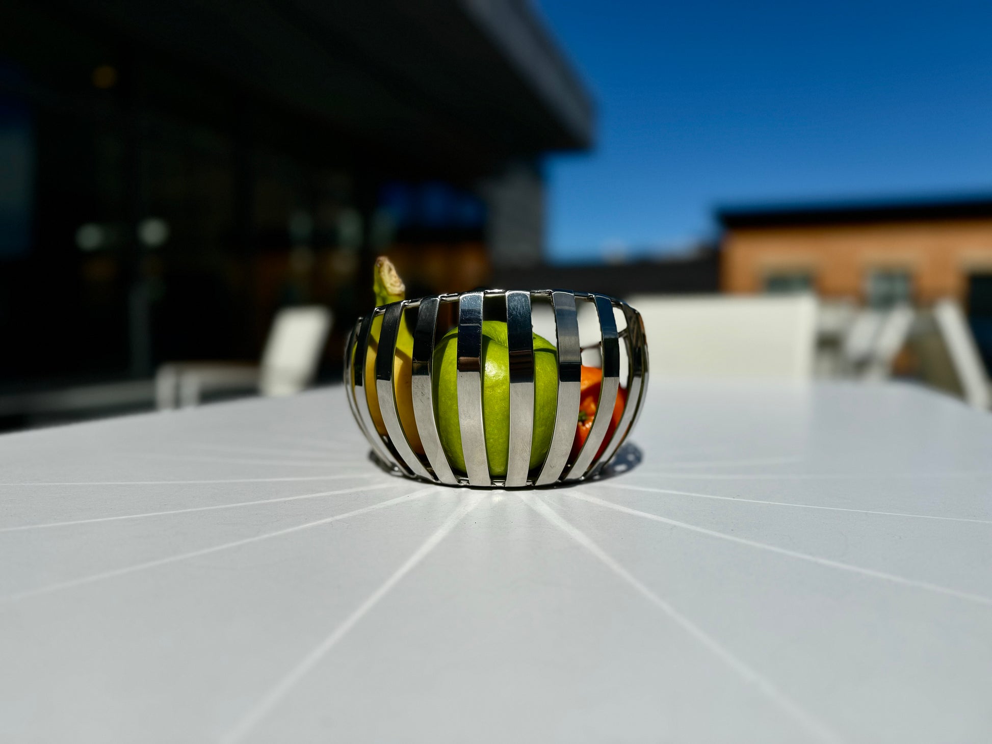 The Basket presents a modern take on a classic form, featuring an openwork design in polished 18/10 high grade Stainless Steel that combines functionality with visual appeal. Its interwoven strips create a light, airy feel, perfect for displaying fruit or decorative items.