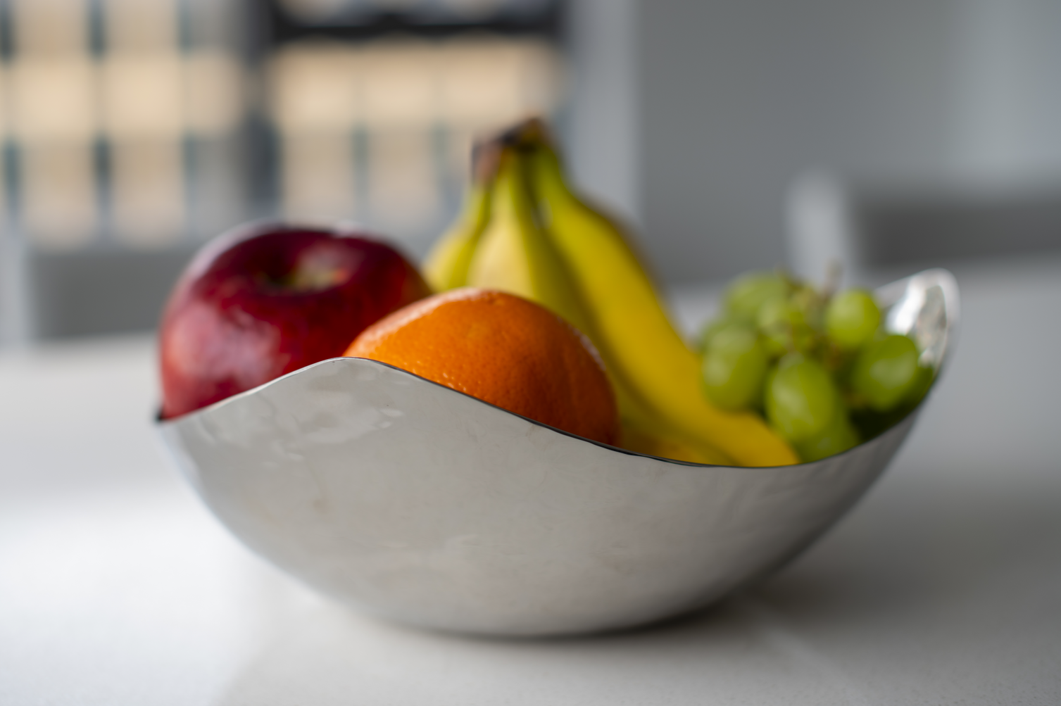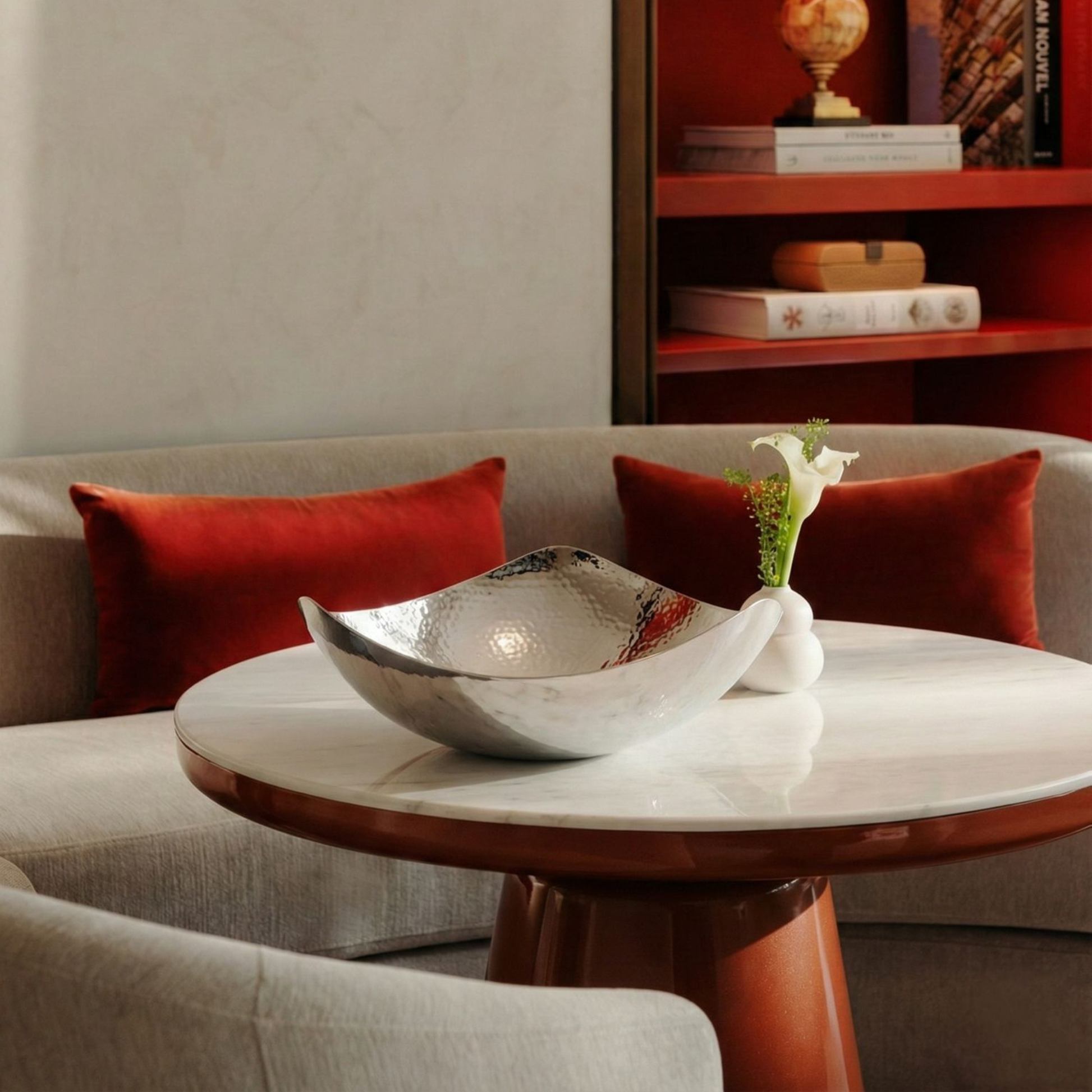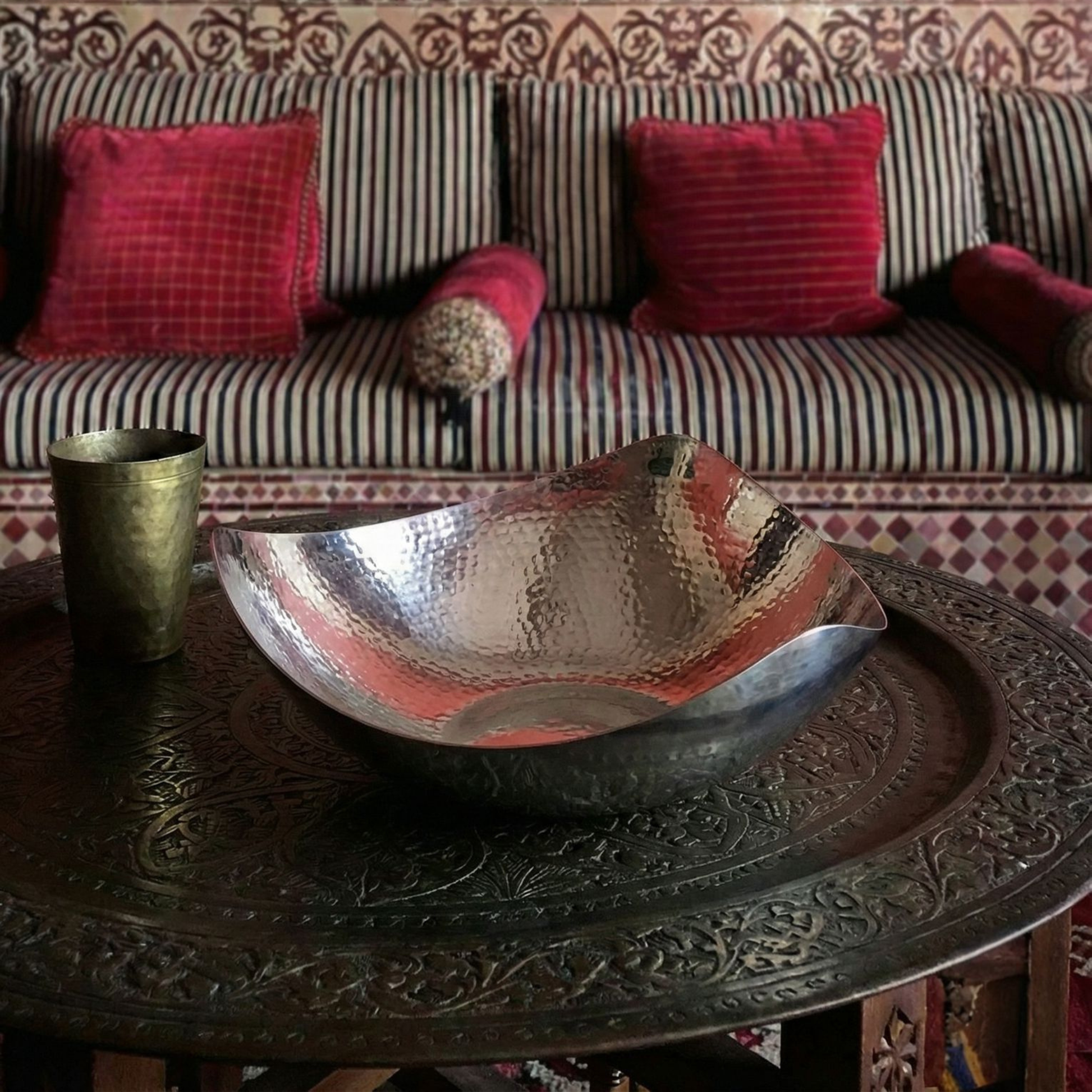 Hammered by hand, this distinctive texture not only adds visual interest but also enhances the reflections, creating a play of light and shadow.