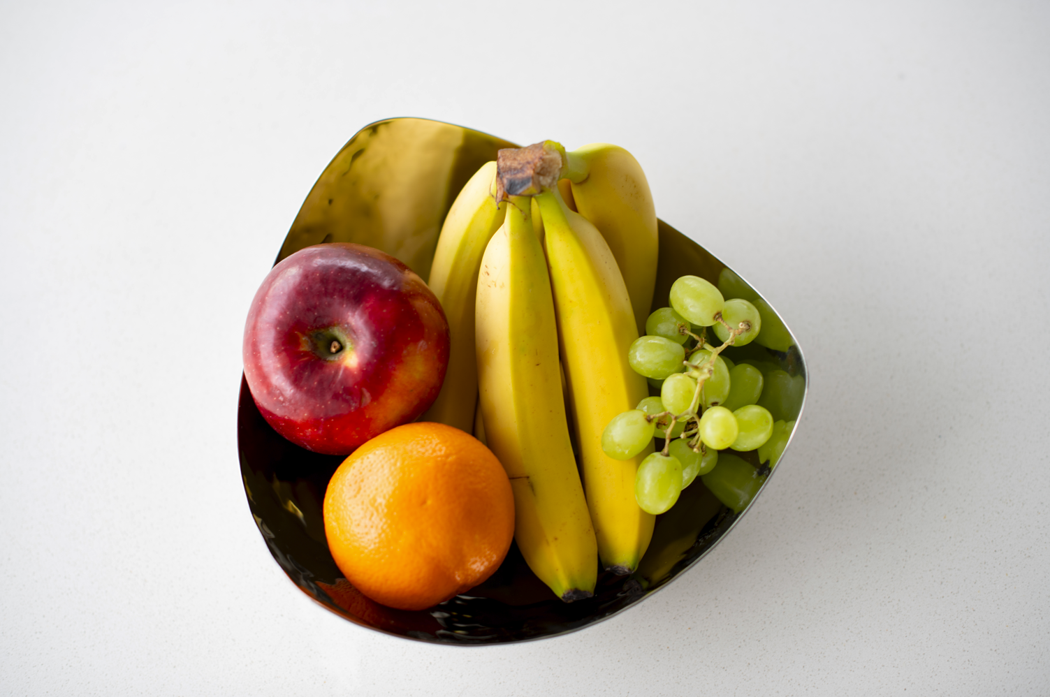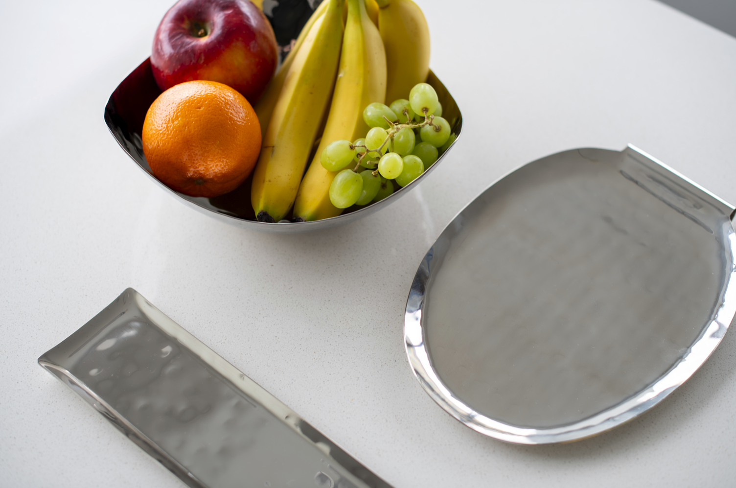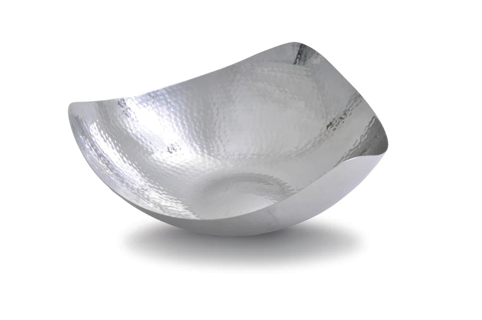Stainless Steel triangular snack bowl with fine hammering effect and satin finish. This bowl is an ideal statement piece for any modern space.