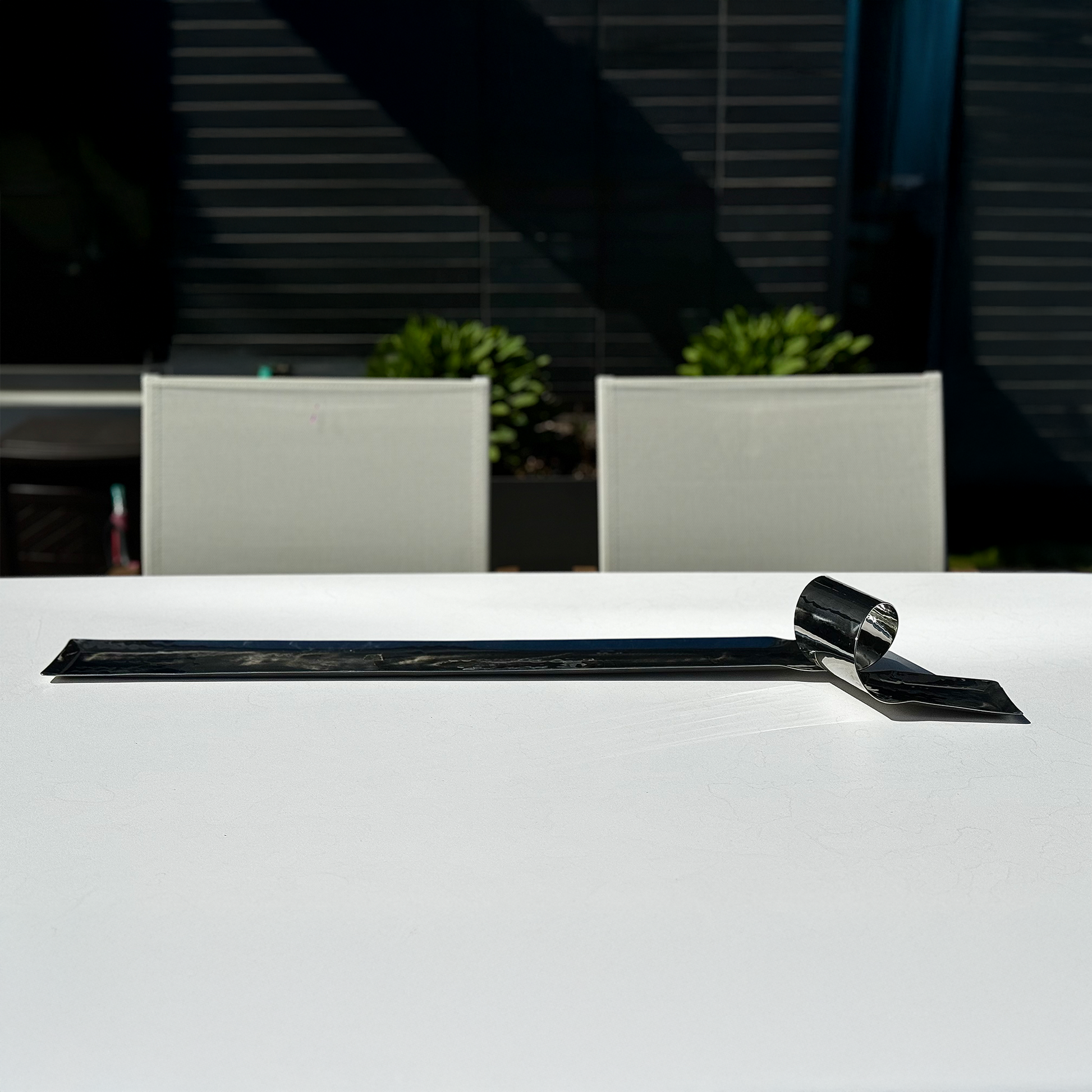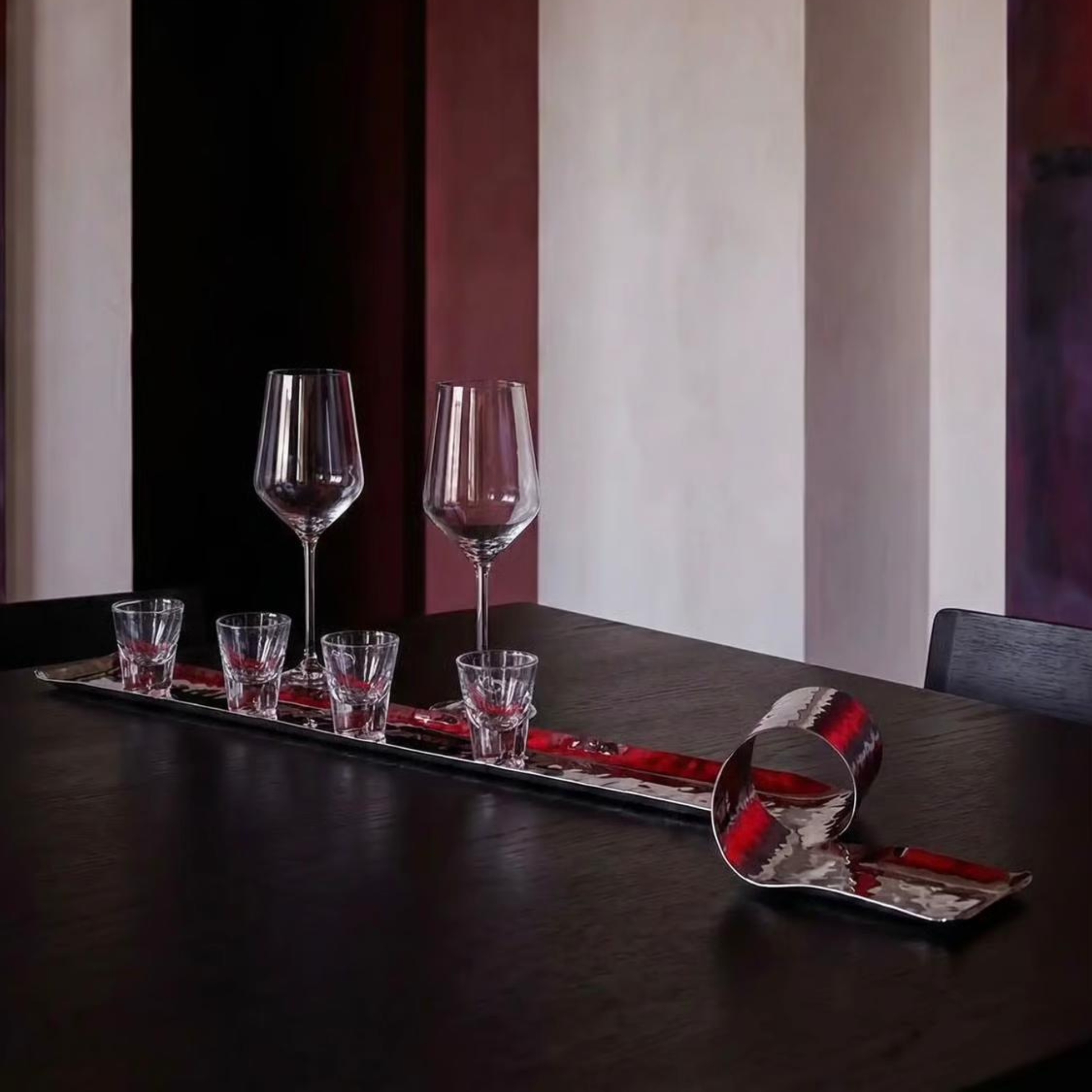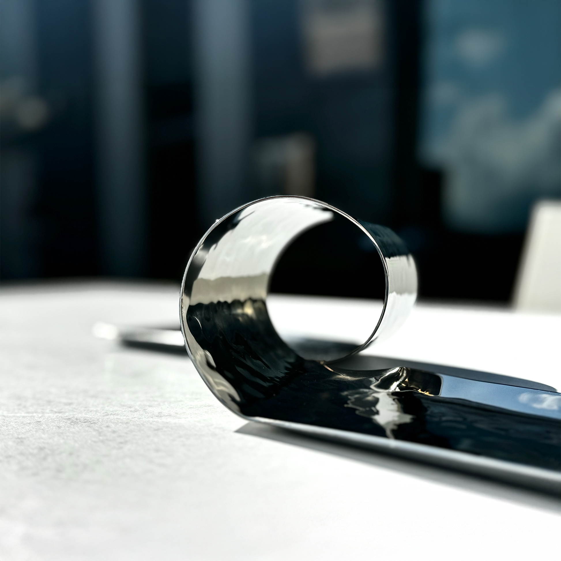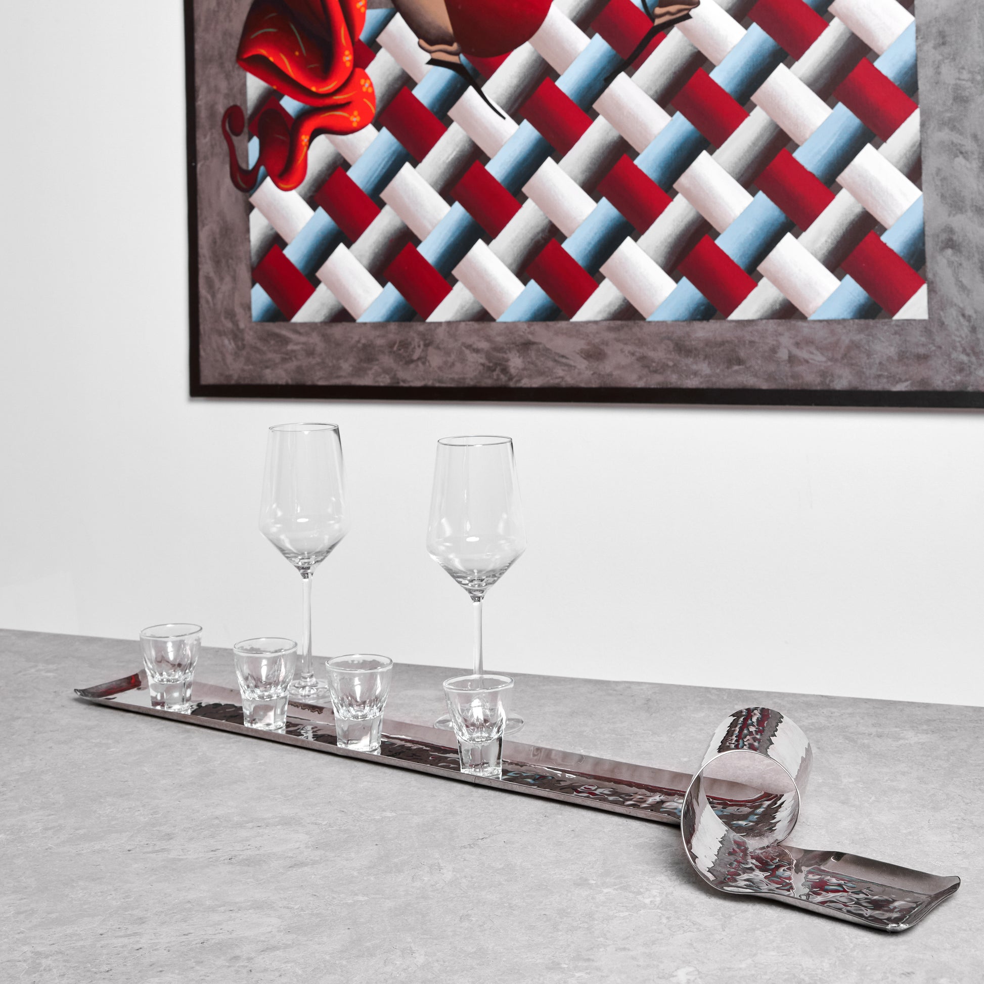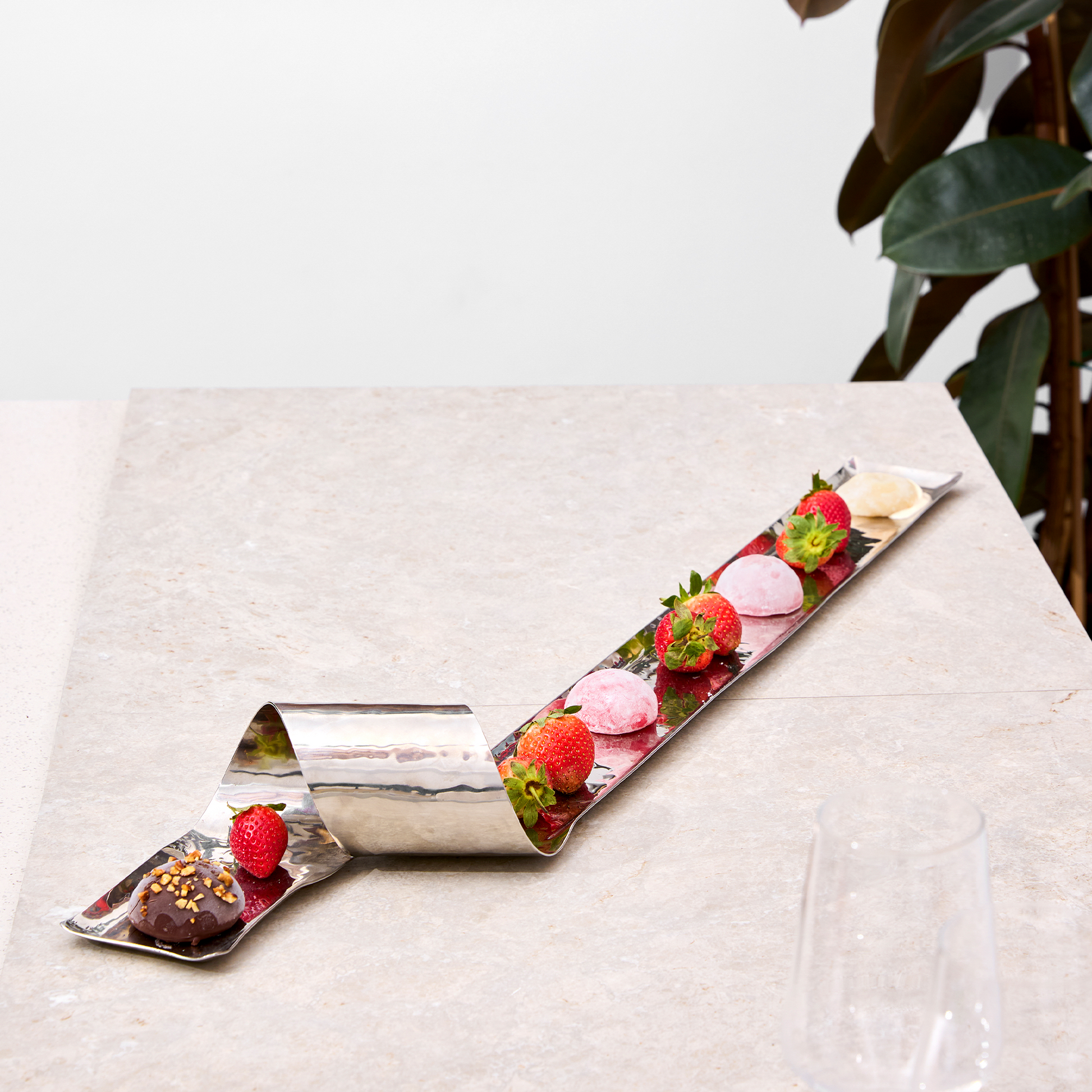 A sleek and modern serving tray, boasting an innovative design that mimics the graceful yet powerful wave it's named after. Its reflective chrome surface and the wave-like twist capture the essence of movement frozen in time. A statement piece for any upscale culinary presentation.